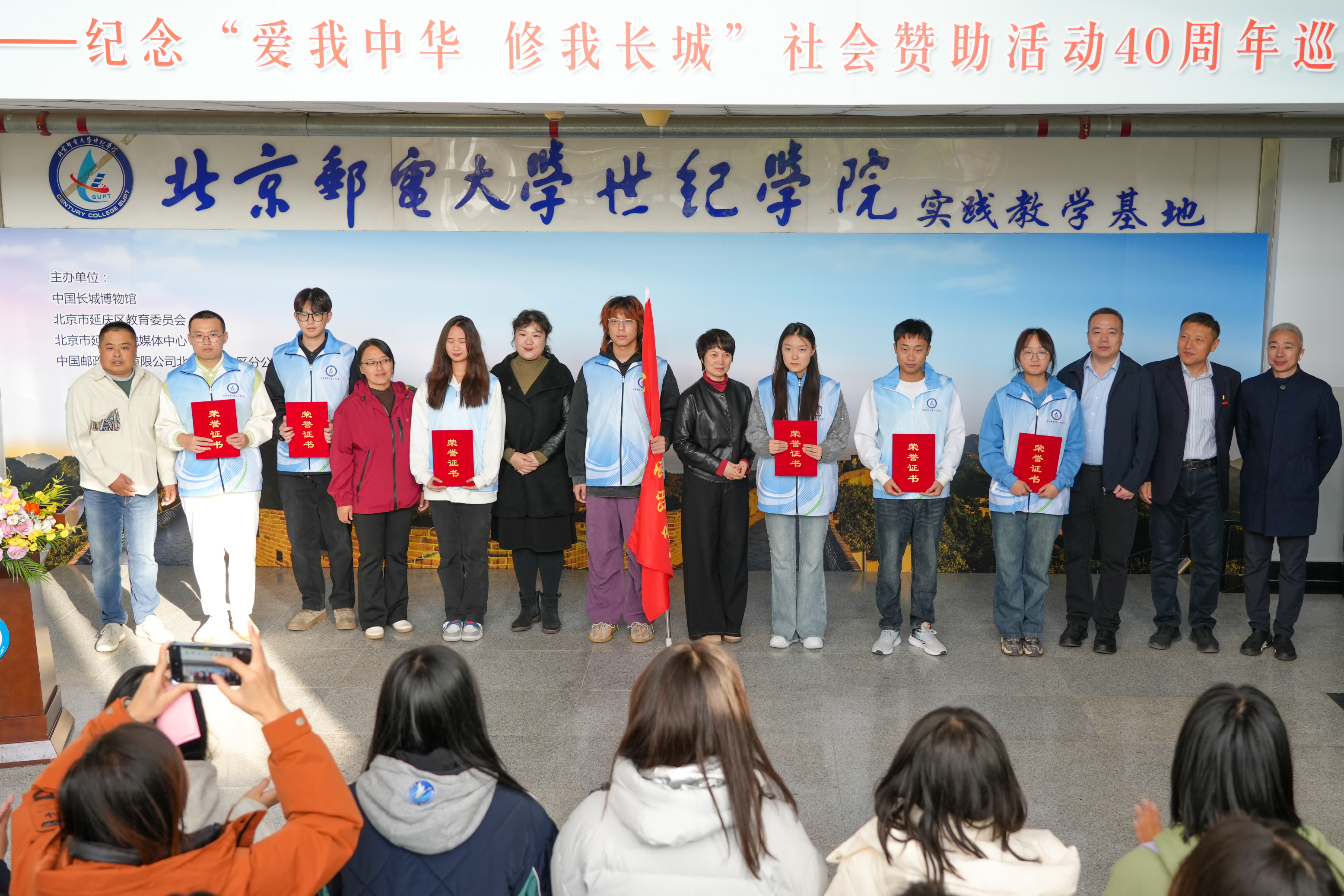中国长城博物馆向学院“世纪青苗”志愿者团队授旗,为志愿者代表颁发“中国长城博物馆‘世纪青苗’长城讲解员”证书。学院学生代表朗诵了由当代著名诗人阿紫创作的诗歌《长城》,并展示了专门为本次展览创作的长城主题书法作品。