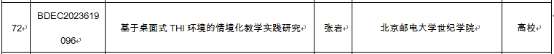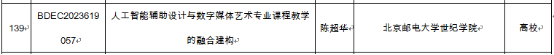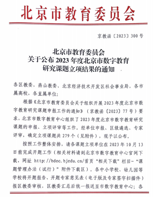 北京市数字教育中心根据《北京市教育委员会关于组织开展2023年度北京市数字教育研究课题申报工作的通知》(京教函〔2023〕77号)要求,经各单位申报、区级遴选、专家评审,确定立项课题共279个。学院推荐的张岩团队申报的青年课题《基于桌面式 TUI 环境的情境化教学实践研究》,以及陈超华团队申报的一般课题《人工智能辅助设计与数字媒体艺术专业课程教学的融合建构》位列其中。