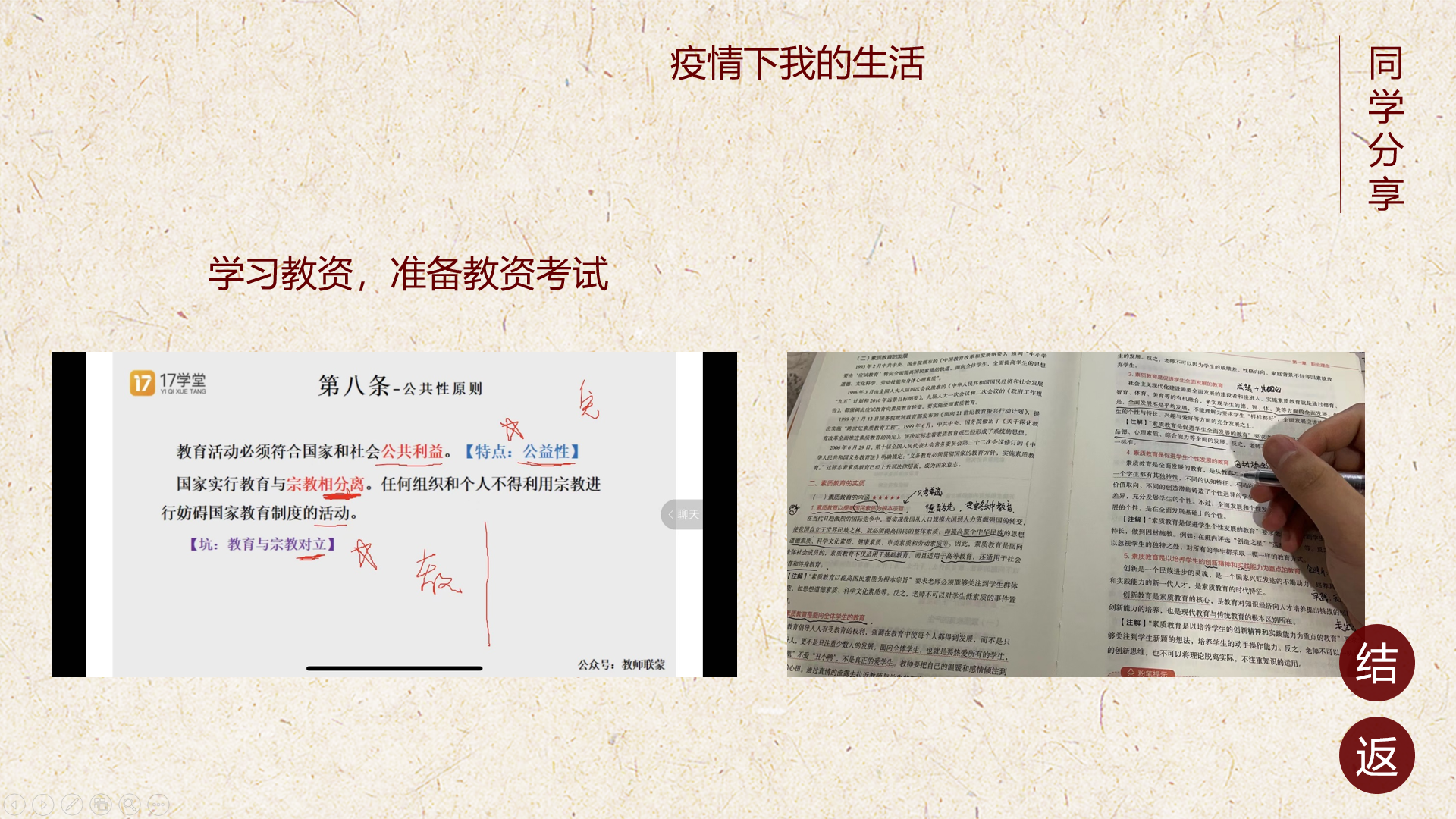 在共青团精神的引领下,青年不畏困难,勇敢向前!在这个不能返校的特殊时期,借助分享会的平台,物流专业的同学代表们依次展示了他们在疫情居家期间的精彩生活:心灵手巧的王苗苗同学展示了自己的针织手工作品,既实用又美观,引来同学们的赞叹;充满艺术细胞的吴晗同学向我们展示了她的绘画作品,绘画功底扎实,绘画作品优美精良;同样爱画画的李俊龙同学爱好画动漫人物,一个个我们熟知的动漫形象跃然纸上;热爱生活的刘宣同学这一次不仅跟我们分享了她倾情制作的甜点,颜值高味道美,更是分享了她在小区因疫情封闭时参加志愿服务的感人片段,同学们都感慨良多;勤恳务实的李楠杰同学梦想成为一名教书育人的老师,他利用课余时间投入教师资格证考试的准备中,并向同学们分享了许多备考的经验;李佳怡同学在这个假期又get到了新技能,现在的她不仅可以把喜欢的小公仔画出来,更是可以捏出一个栩栩如生的3D形象,真是一个集颜值与实力于一身的好团支书;父母的小棉袄吴泷同学在家苦练厨艺,已经成为家庭的厨房积极分子,厨艺也是肉眼可见的进步!