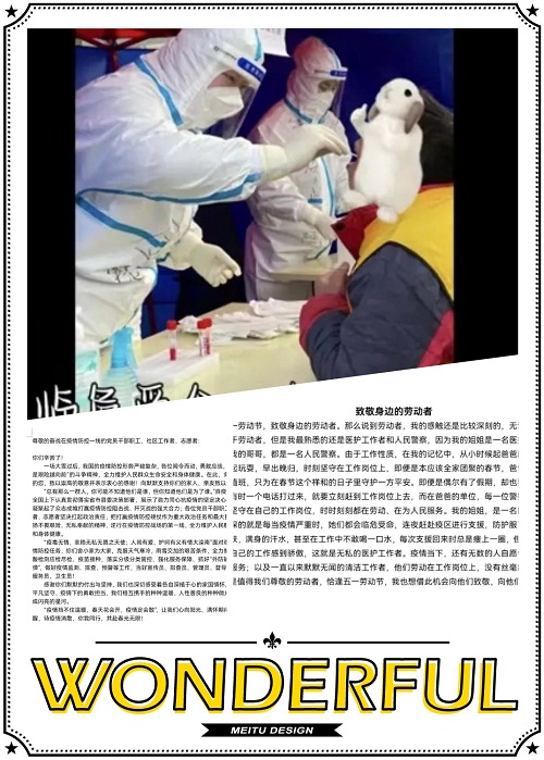 以梦为马,以劳为缰。劳动者用勤劳的双手和智慧,编制了这个五彩斑斓的世界,创造了人类文明。让我们在这个特别的日子里,向全世界的劳动者致敬。此次活动在5月1日正式展开,同学们收集身边劳动人民的一点一滴。有辛苦的医护人员“大白”,有恪守岗位的交警叔叔,有默默无闻的志愿者,也有在高温下仍然劳作的施工人员...... 这些光荣的劳动模范们在平凡的岗位上,用辛勤劳动,赢得了荣光,赢得了尊敬!同学们记录下一段又一段劳动者的vlog,每一帧的画面无不记录着劳动者对生活的热爱,对美好的憧憬。同学们认真记录,精心剪辑,即使没有华丽的文案和旁白,每一个镜头都是对劳动者崇高的敬意。