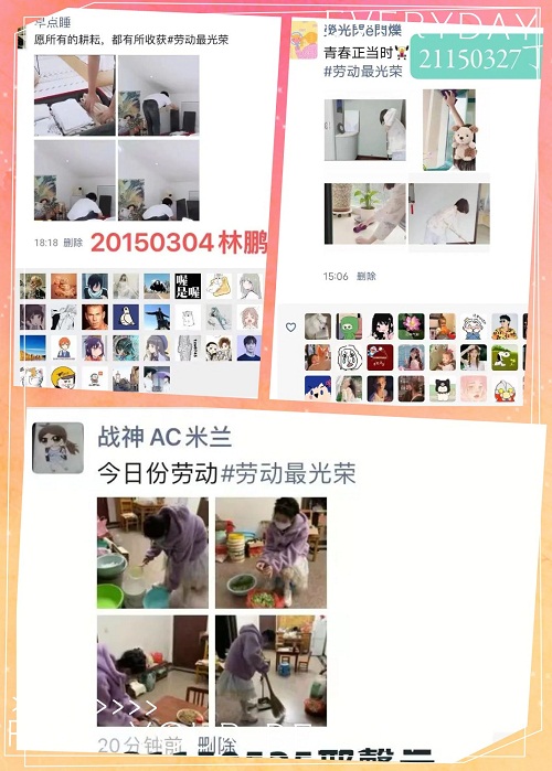 在劳动节当天,同学们分别进行了不同的家务劳动。亲身参与劳动,自己享受劳动成果,感受劳动的魅力,为父母分担家务。有打扫房间的,有帮忙拖地的,有帮忙洗碗的,有擦拭橱窗的。同学们认真参与劳动并录制视频,在家劳动,为疫情居家的学习生活增添一抹洁净,同时感受生活中劳动的滋味。大家通过发布关于劳动话题的朋友圈,向身边人传达劳动的重要性,以行动传达“劳动光荣”的理念。培养劳动观念,树立劳动习惯。