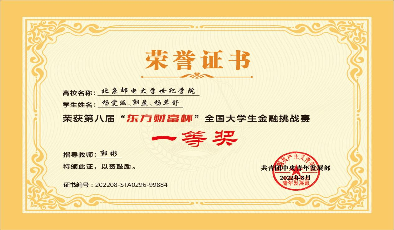 近日,2022年“东方财富杯”全国大学生金融素养提升活动总结颁奖会在中央财经大学举办。学院经济管理系积极动员学生参赛,历时4个月完成校赛、省赛、国赛三个阶段的比赛。经济管理系学子杨雯涵、郭盈、杨茸舒在教师郭彬的指导下,在全国2550所高校61万余名参赛学生中脱颖而出,荣获全国一等奖。