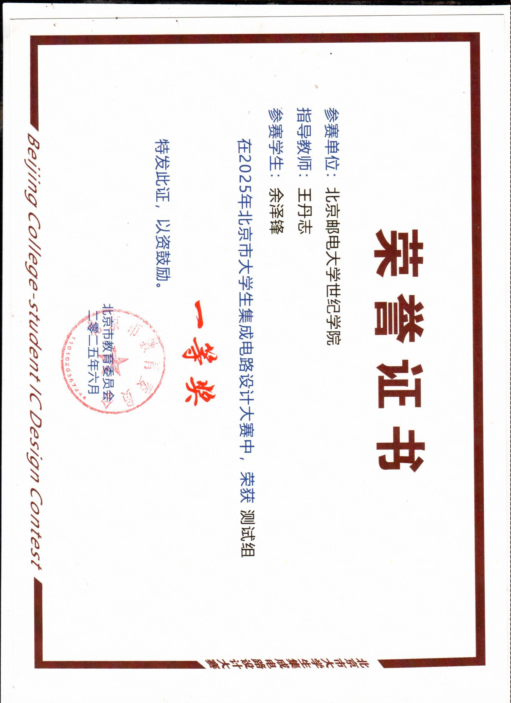 近日,“2025年北京市大学生集成电路设计竞赛”结果揭晓。学院学子在“芯片测试组”新增赛道中荣获一等奖,在“数字集成电路设计组”等传统赛道荣获二等奖2项、三等奖4项、优秀奖2项。通信与信息技术系教师王丹志、张震荣获“优秀指导教师”称号。