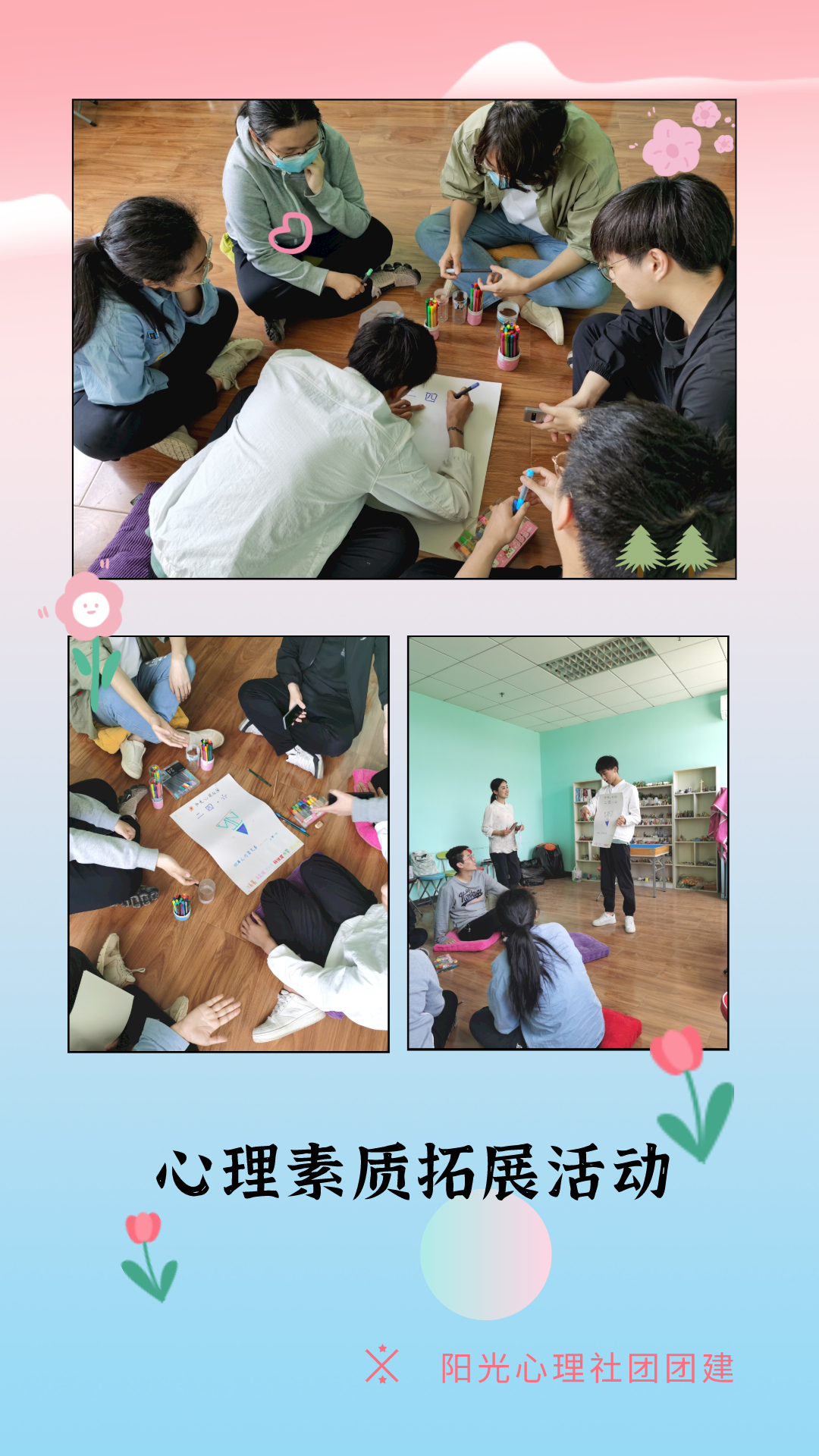 本次活动由心理咨询中心指导,选择了大学生喜闻乐见的内容和形式,通过海报、横幅、班级心理委员等途径进行宣传,由阳光心理社团负责推广、组织和开展,通过一系列学生活动营造了朋辈间互帮互助、共同成长的良好氛围,得到了在校学生的喜爱和积极参与,在宣传心理健康知识、引导大学生关注自身心理健康的同时,也丰富了学生的校园生活,激发了学生对探索和完善自我的兴趣,满足了在校大学生对心理健康活动的需求。 (学生处心理咨询中心冯枫供稿)
