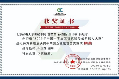 近日,2023年中国大学生工程实践与创新能力大赛企业运营仿真竞赛全国总决赛在山东大学中心校区落幕。学院经济管理系学生姜丁文、郭芷涵在牛玉英和秦珠老师的指导下,在省赛中以第一名、第五名的成绩脱颖而出,成功晋级国赛,双双荣获全国总决赛铜奖。这是学院首次在该项赛事中获得国家级奖项。