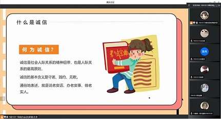 期末考试前夕,为加强同学们的诚信教育,2019级通信工程、电子信息专业在各班班委精心组织下,分别利用腾讯会议平台线上开展了“诚信考试从我做起”主题班会。