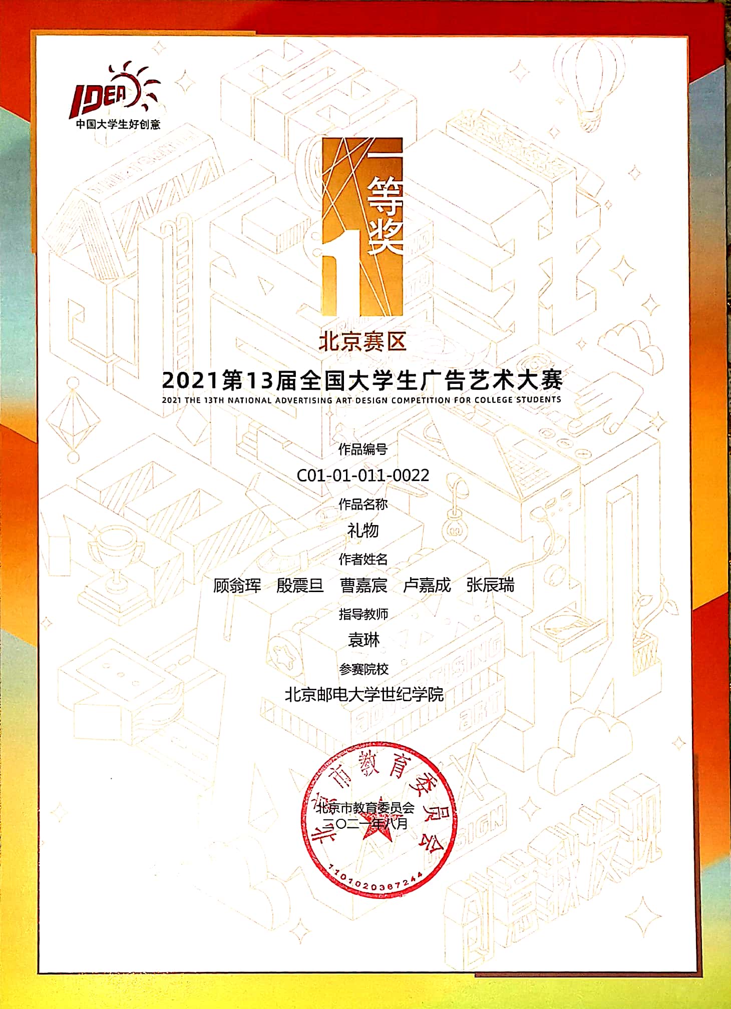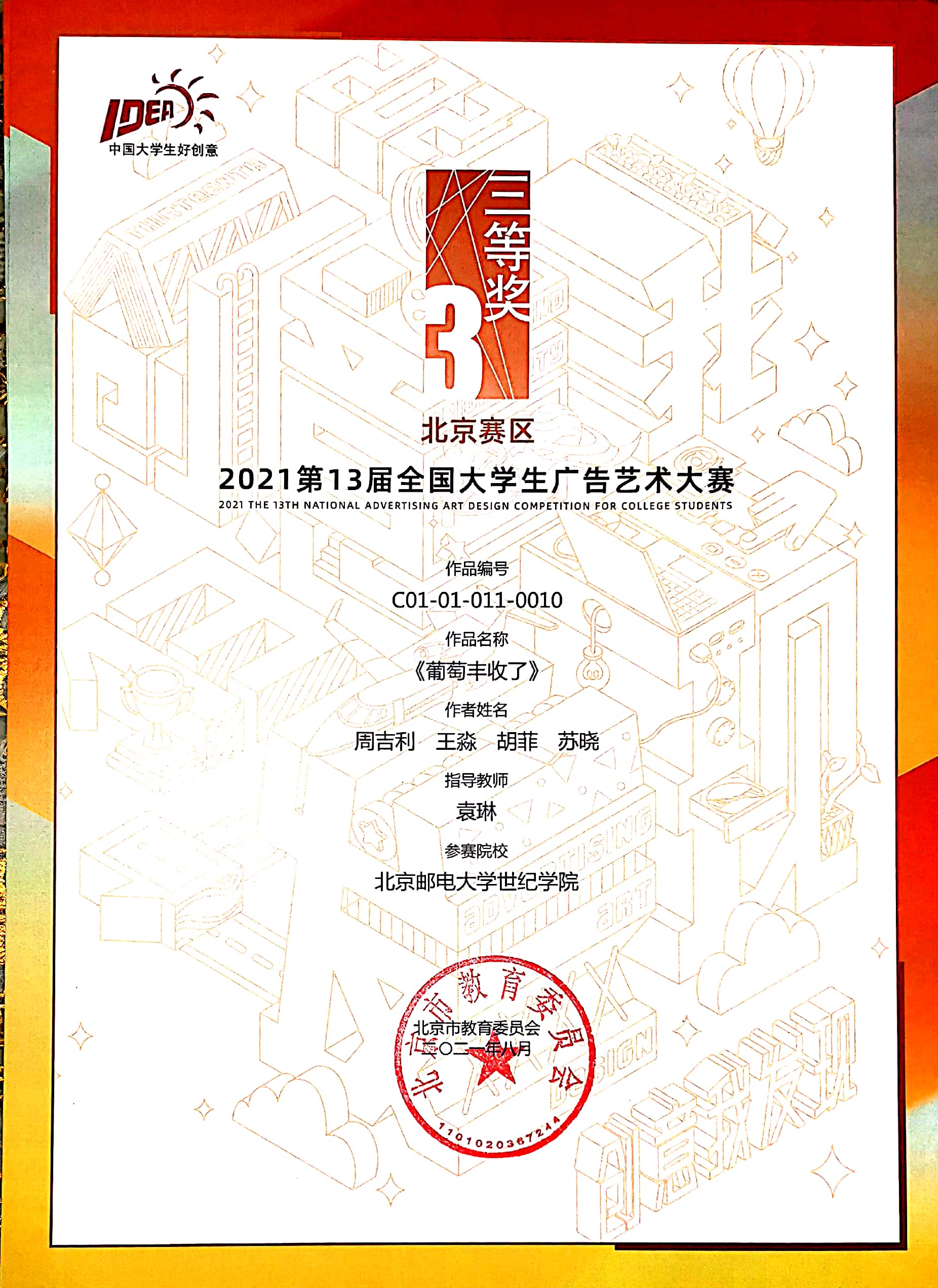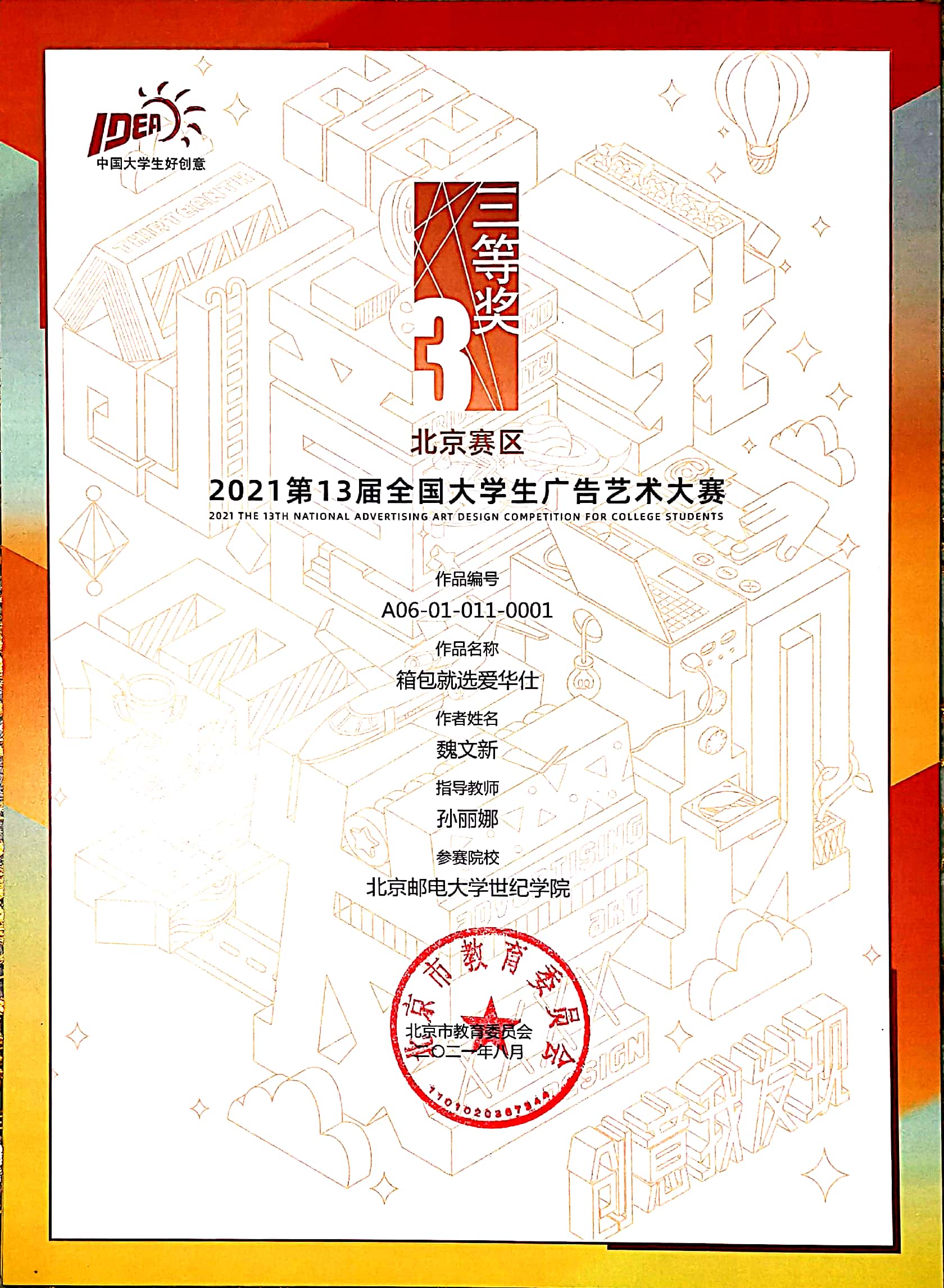 2021年10月23日2021第13届大广赛北京赛区颁奖典礼在北京服装学院圆满结束。我院艺术与传媒学院袁琳、孙丽娜、孟旭、魏程华老师共指导了22项作品获奖,其中袁琳老师指导的《礼物》荣获一等奖。另有作品获二等奖2项、三等奖5项、优秀奖14项。