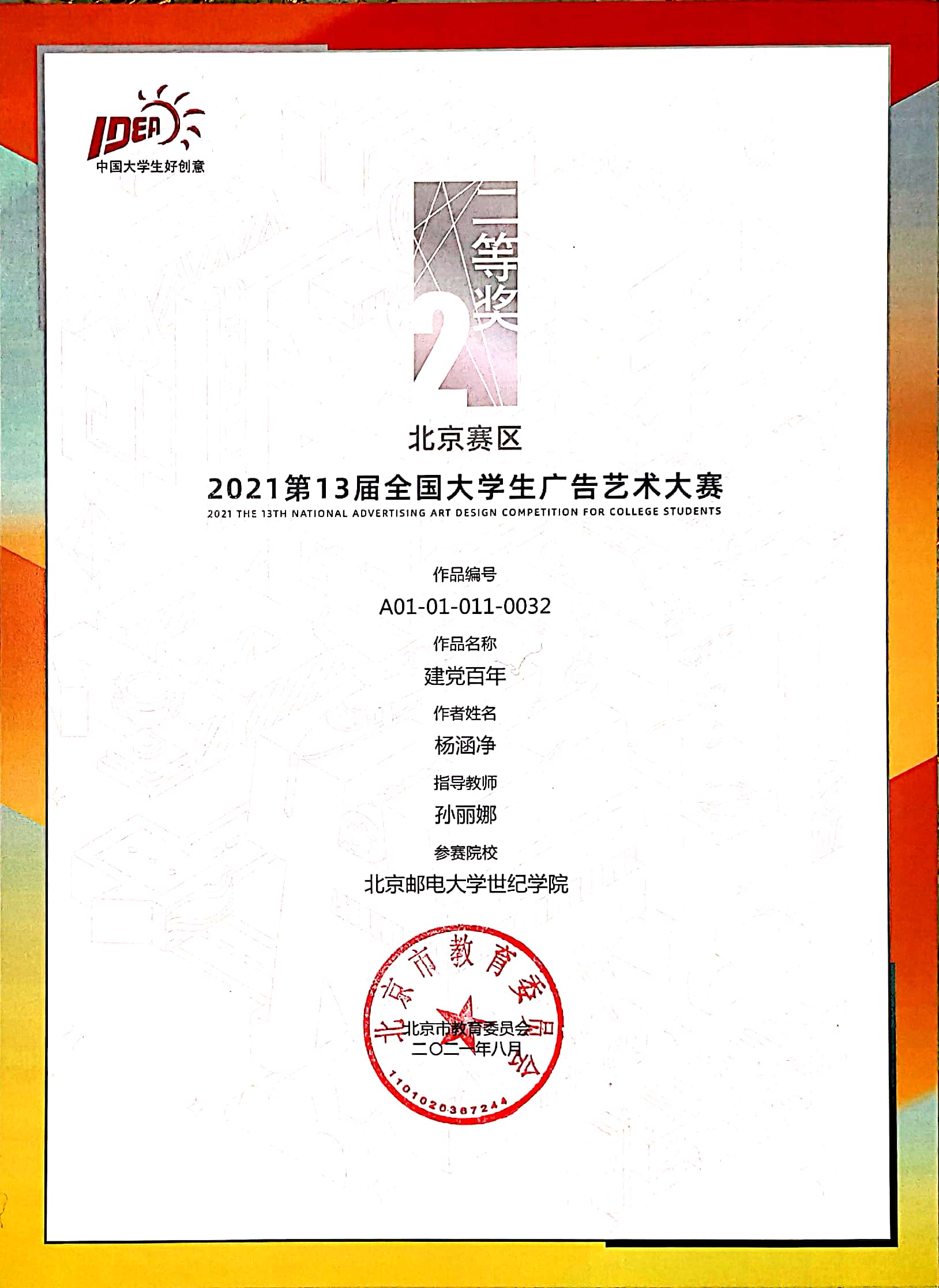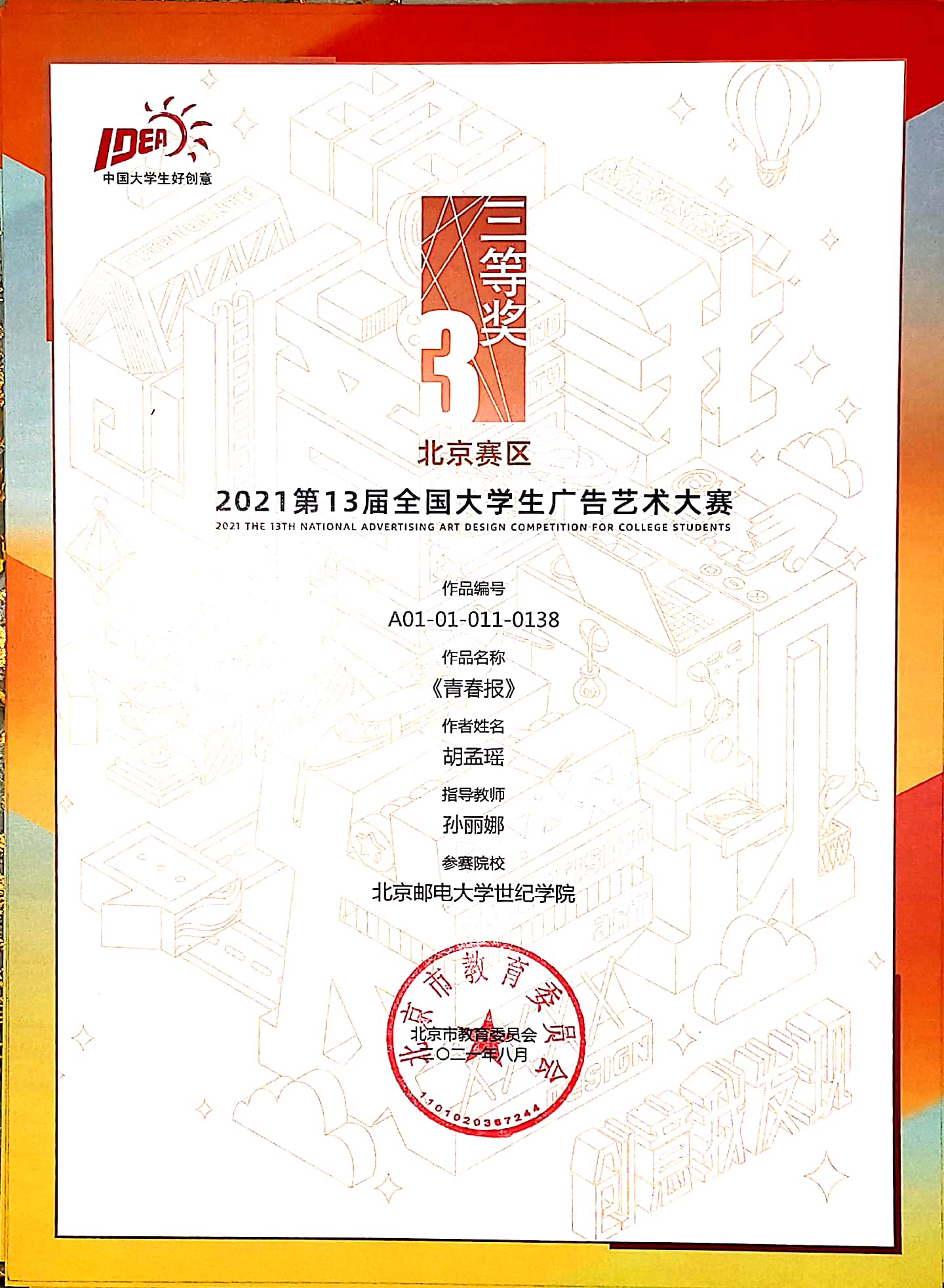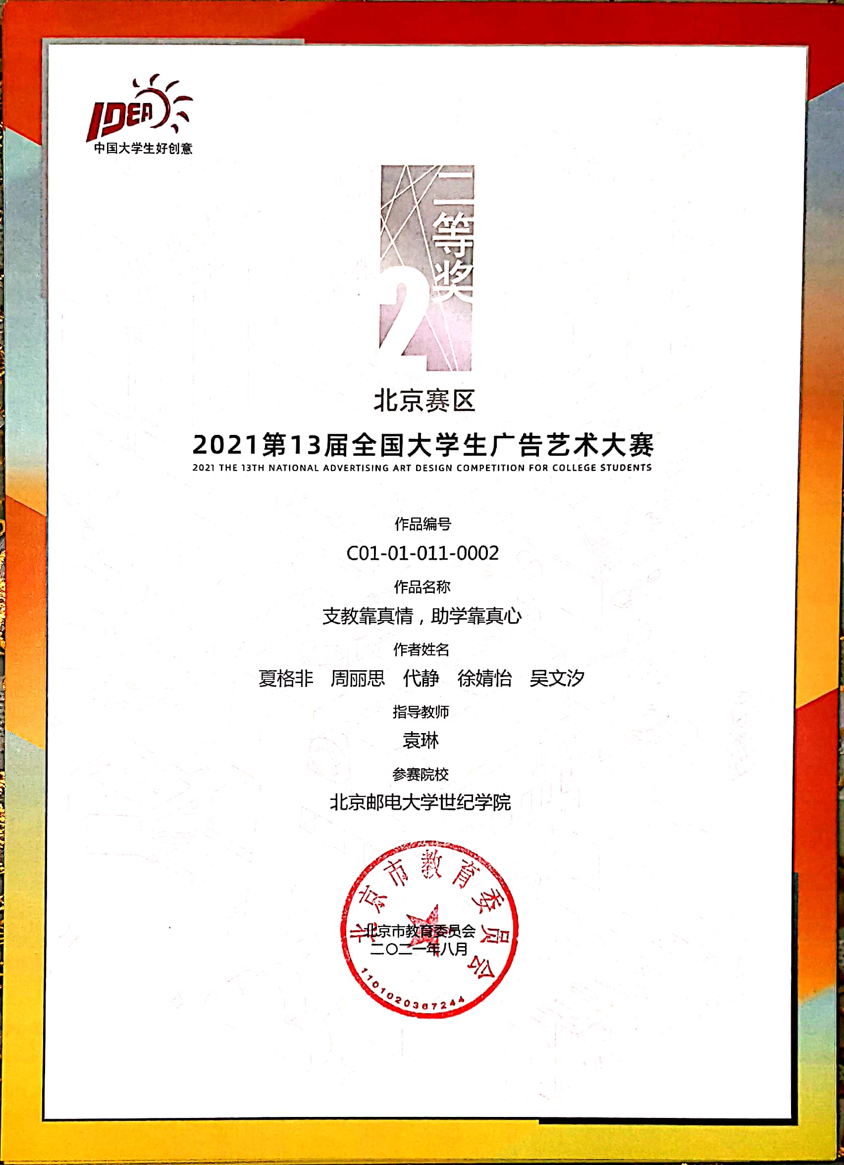 2021年10月23日2021第13届大广赛北京赛区颁奖典礼在北京服装学院圆满结束。我院艺术与传媒学院袁琳、孙丽娜、孟旭、魏程华老师共指导了22项作品获奖,其中袁琳老师指导的《礼物》荣获一等奖。另有作品获二等奖2项、三等奖5项、优秀奖14项。