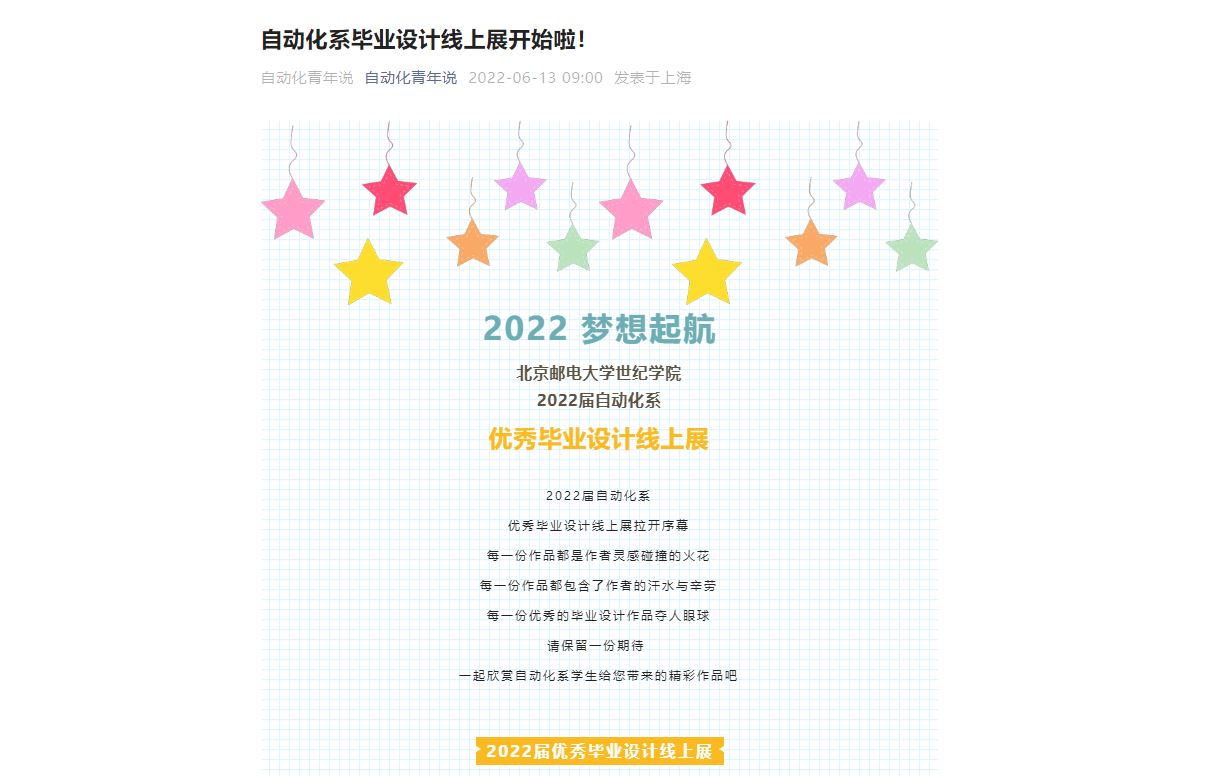 为巩固线上教育教学效果,展示自动化系2022届毕业生优秀毕业设计作品,自动化系自6月13日起在系部微信公众号平台“自动化青年说”开展了为期近一周的2022届优秀毕业设计线上展示活动。