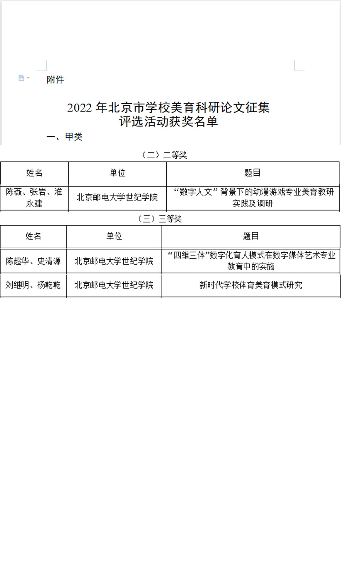 学院陈薇、张岩、淮永建老师论文《“数字人文”背景下的动漫游戏专业美育教研实践及调研》荣获甲类二等奖,陈超华老师论文《“四维三体”数字化育人模式在数字媒体艺术专业教育中的实施》,刘继明、杨乾乾老师论文《新时代学校体育美育模式研究》荣获甲类三等奖。