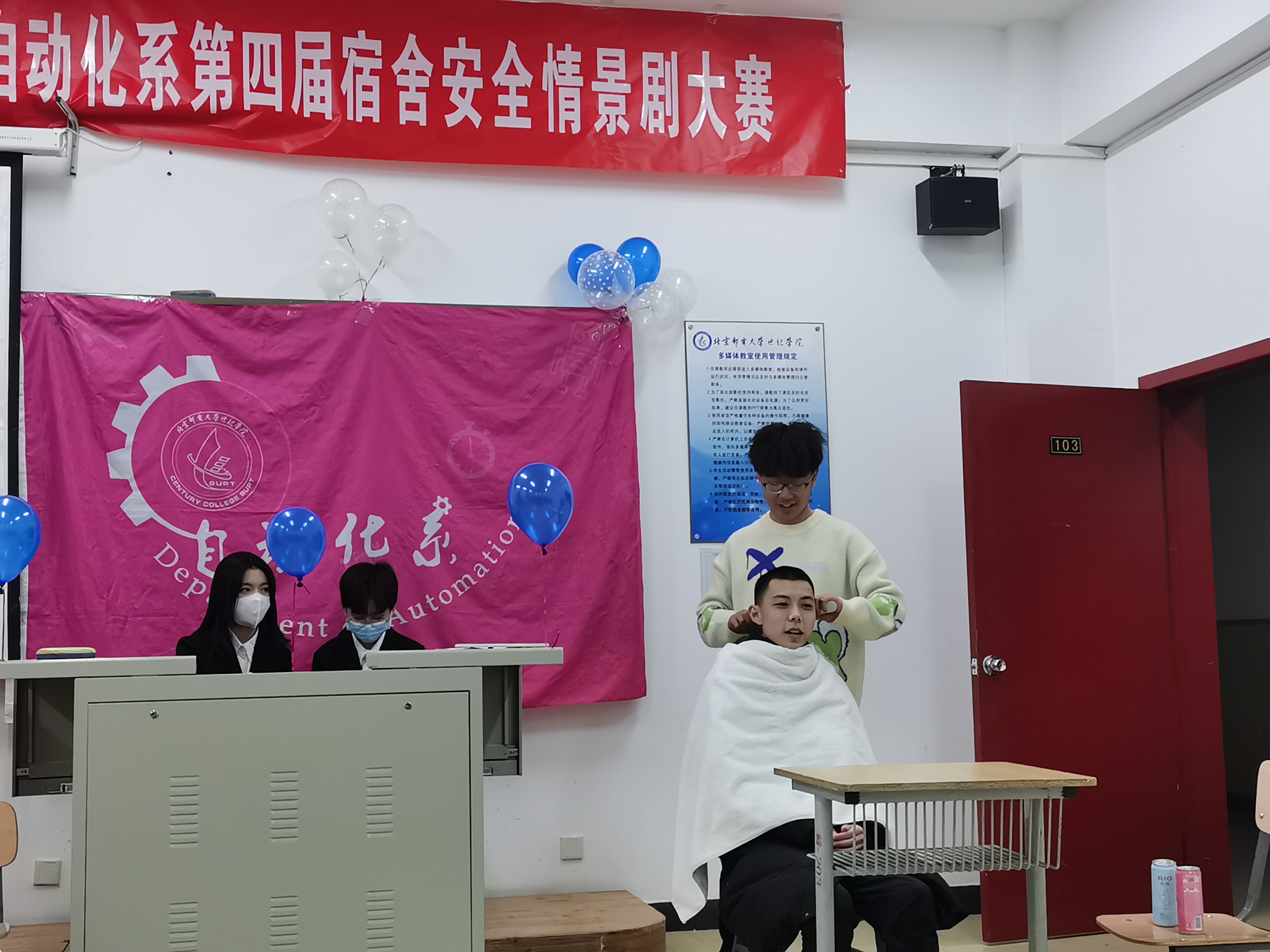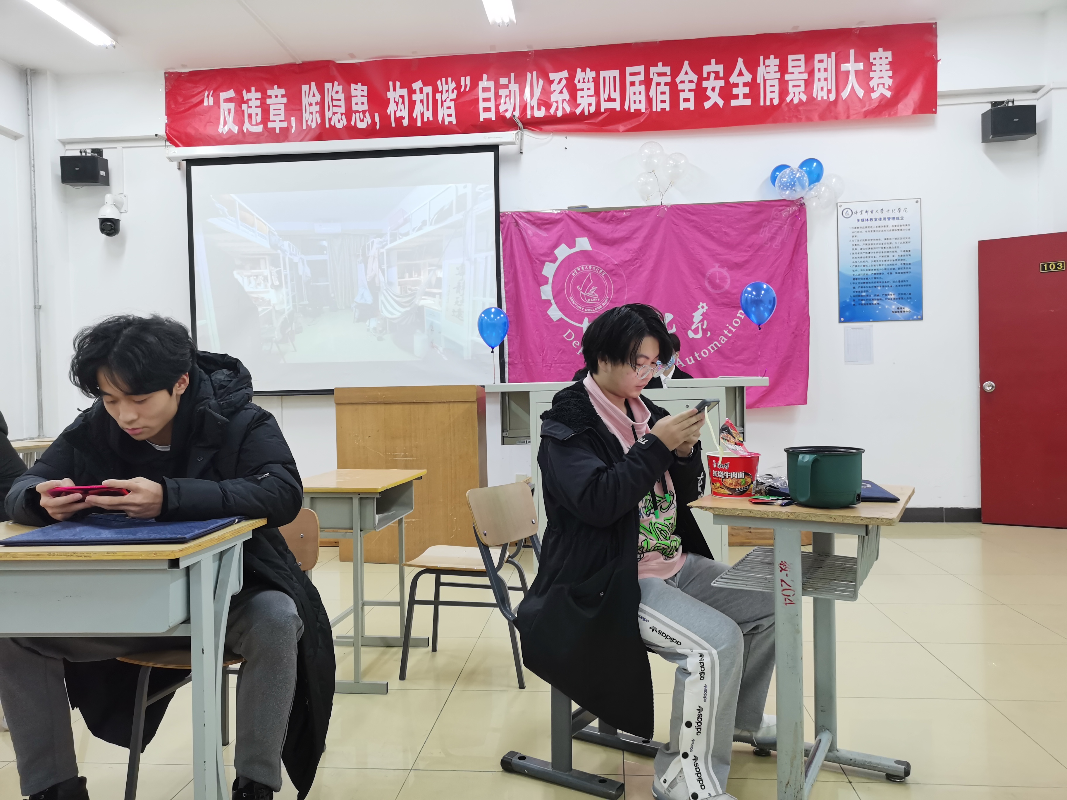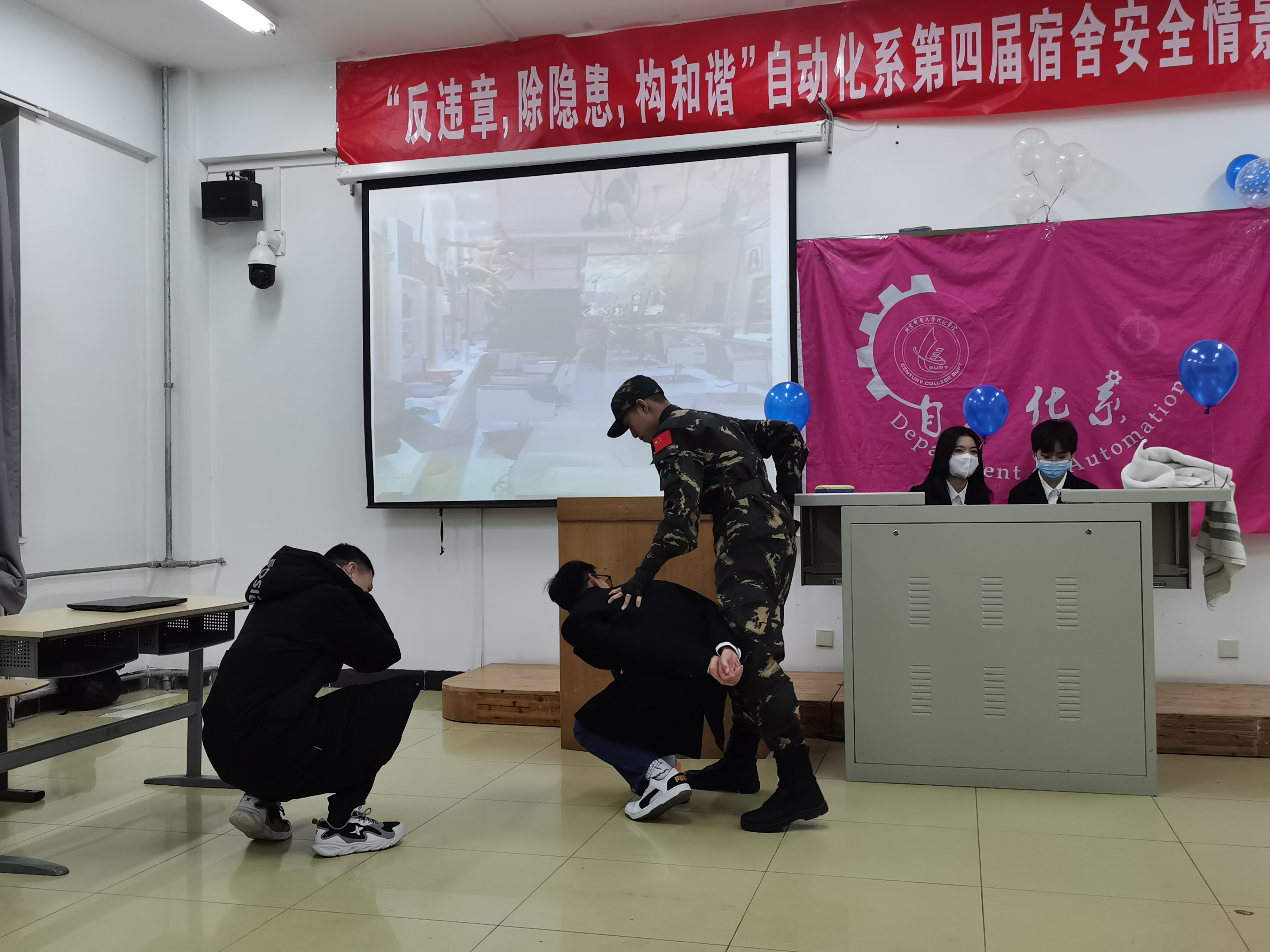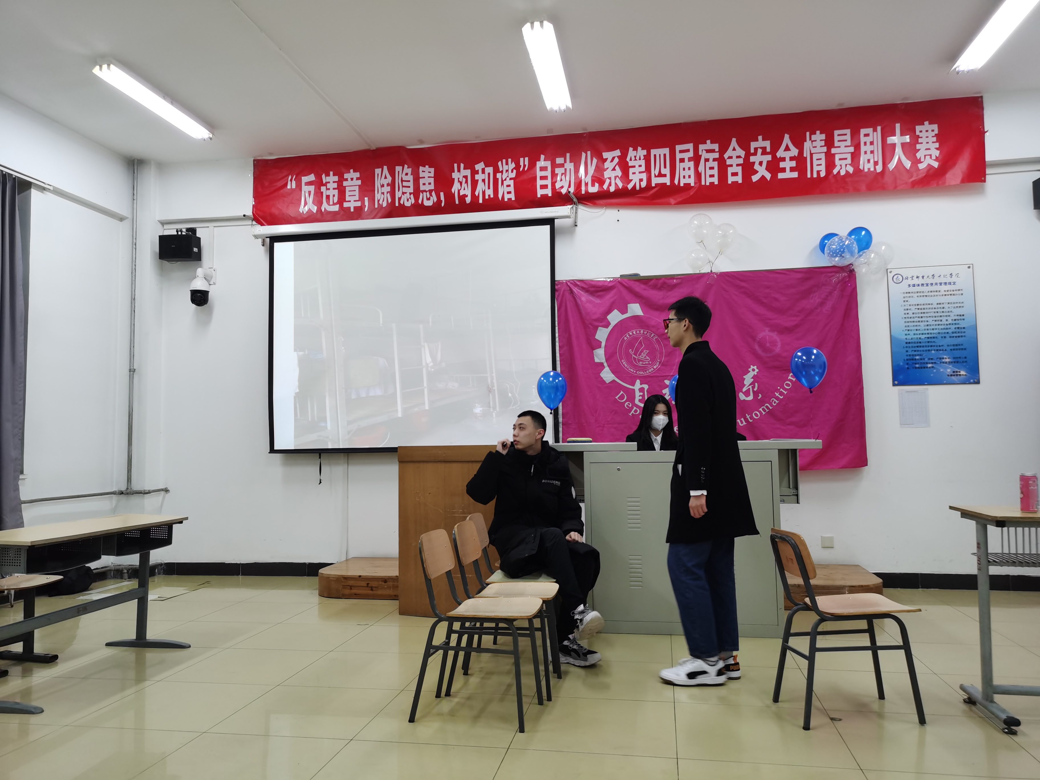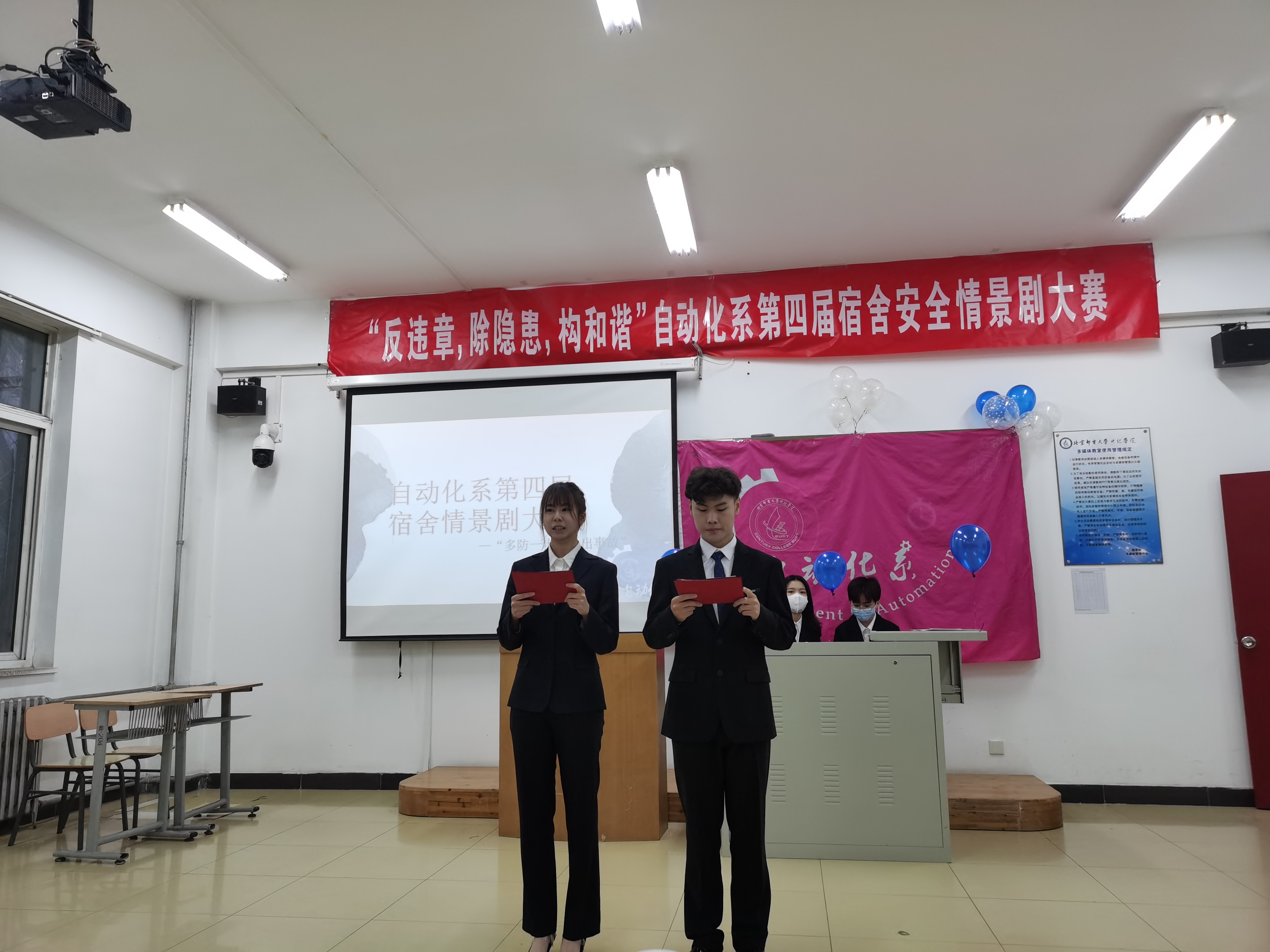 2021年12月3日17:00,反违章 除隐患 构和谐”自动化系第四届宿舍安全情景剧大赛在学思楼103报告厅成功举办。系副主任郭超、团总支书记徐莉莉,辅导员闫雪、袁未、田佳欣老师,各兄弟系(院)学生骨干及自动化学生到场参加。