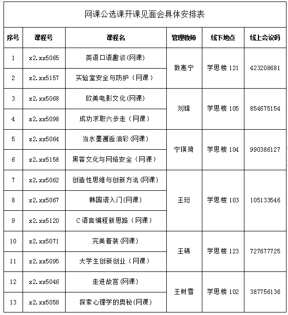 为加强网络课程管理,保障网课教学质量和教学效果,依据《英国上市公司365网络课程管理办法》 (院教字[2018]1号)要求,结合本学期网课开设情况,我院为网课公选课配备相应的管理教师,并定于9月12日(第四周周一)下午17:00召开首次网课见面会。本次见面课采取线上线下同步的方式,线上平台统一为腾讯会议。已返校同学且未隔离的同学需参加线下开课见面会,管理教师将核实线下学生名单。具体安排情况详见下表: